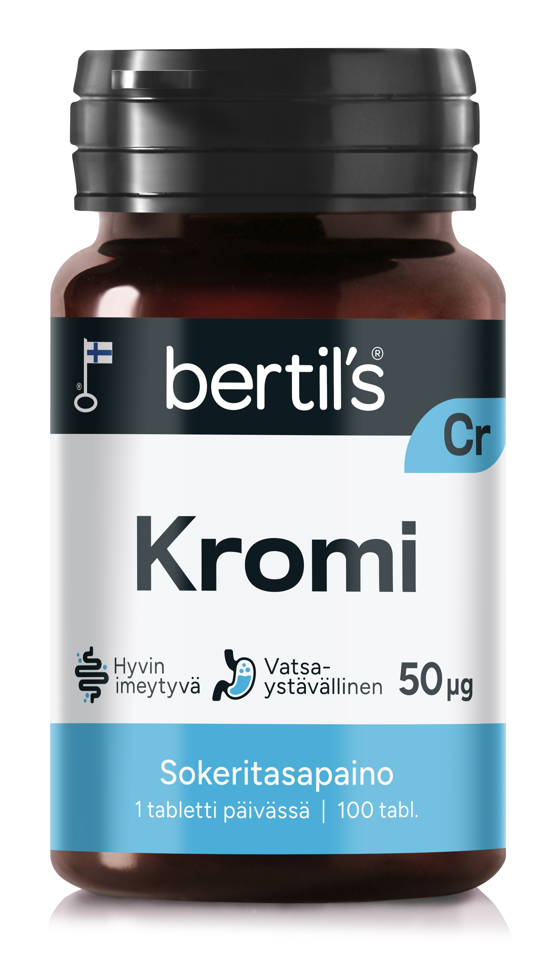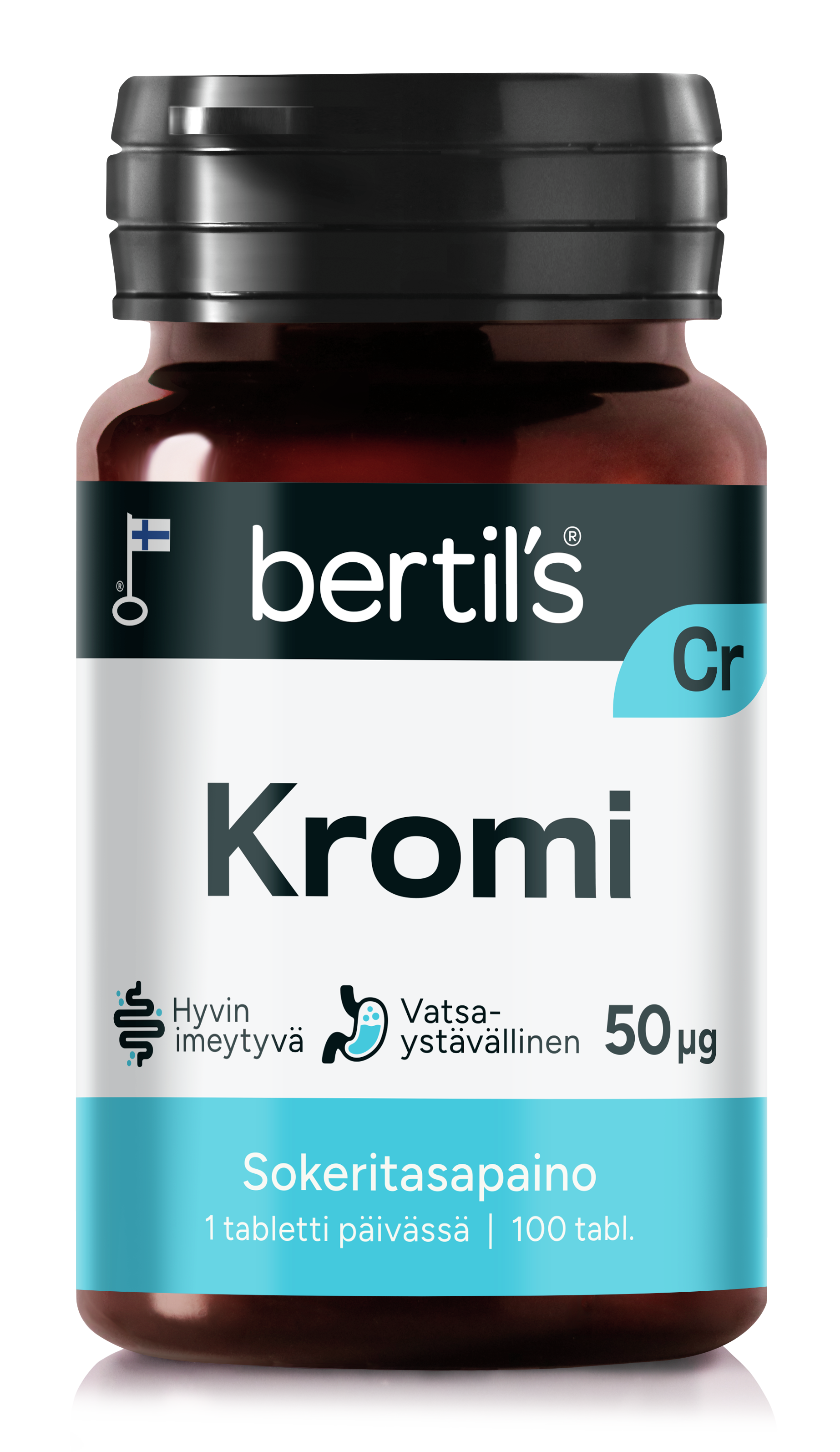 bertil’s Kromi sisältää 50 μg erinomaisesti elimistöön imeytyvää kromipikolinaattia, joka ei ärsytä vatsaa. Kromia tarvitaan elimistön tasapainoiseen sokeriaineenvaihduntaan ja kromi edistääkin verensokeriarvojen pysymistä normaalina.