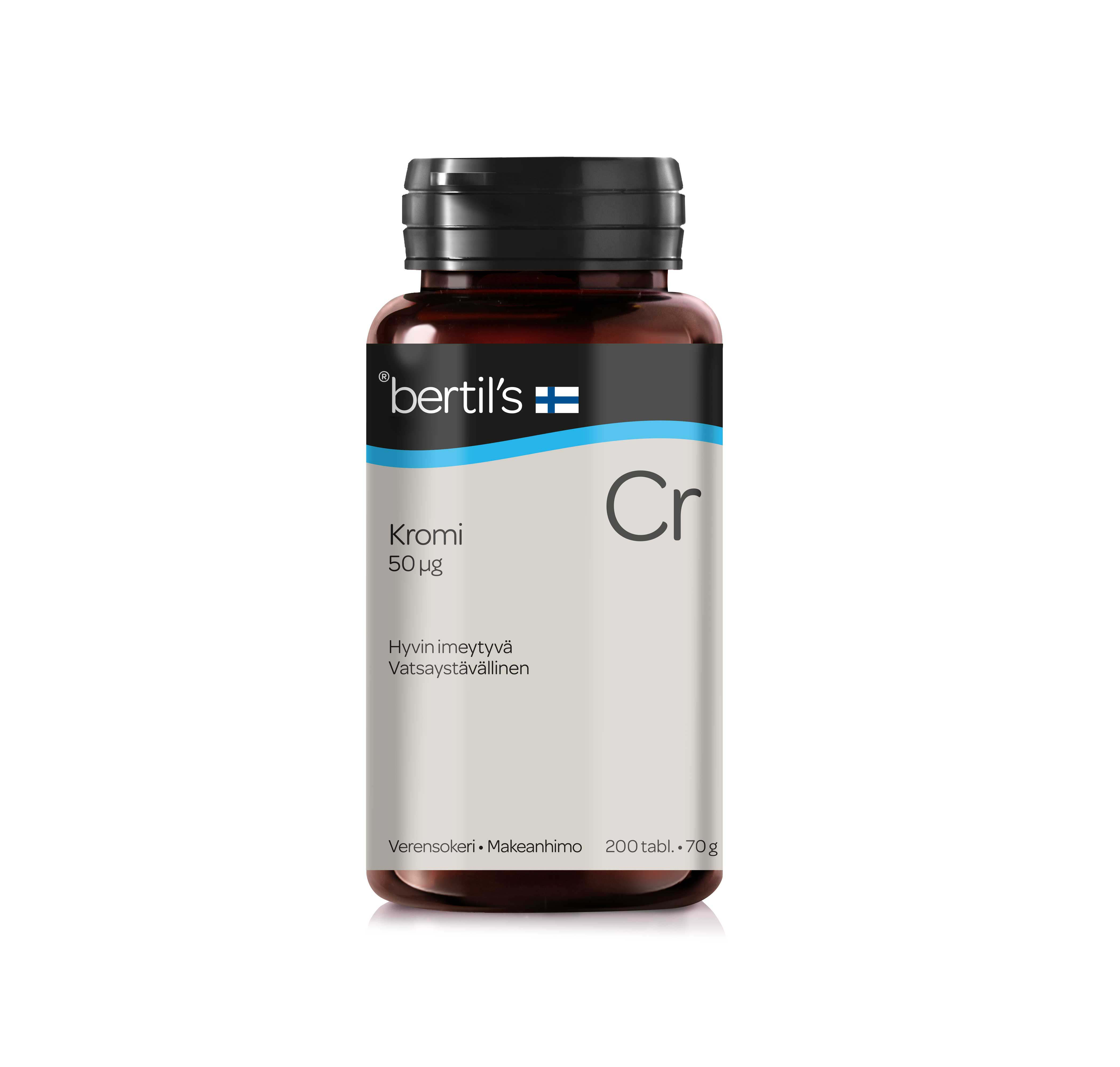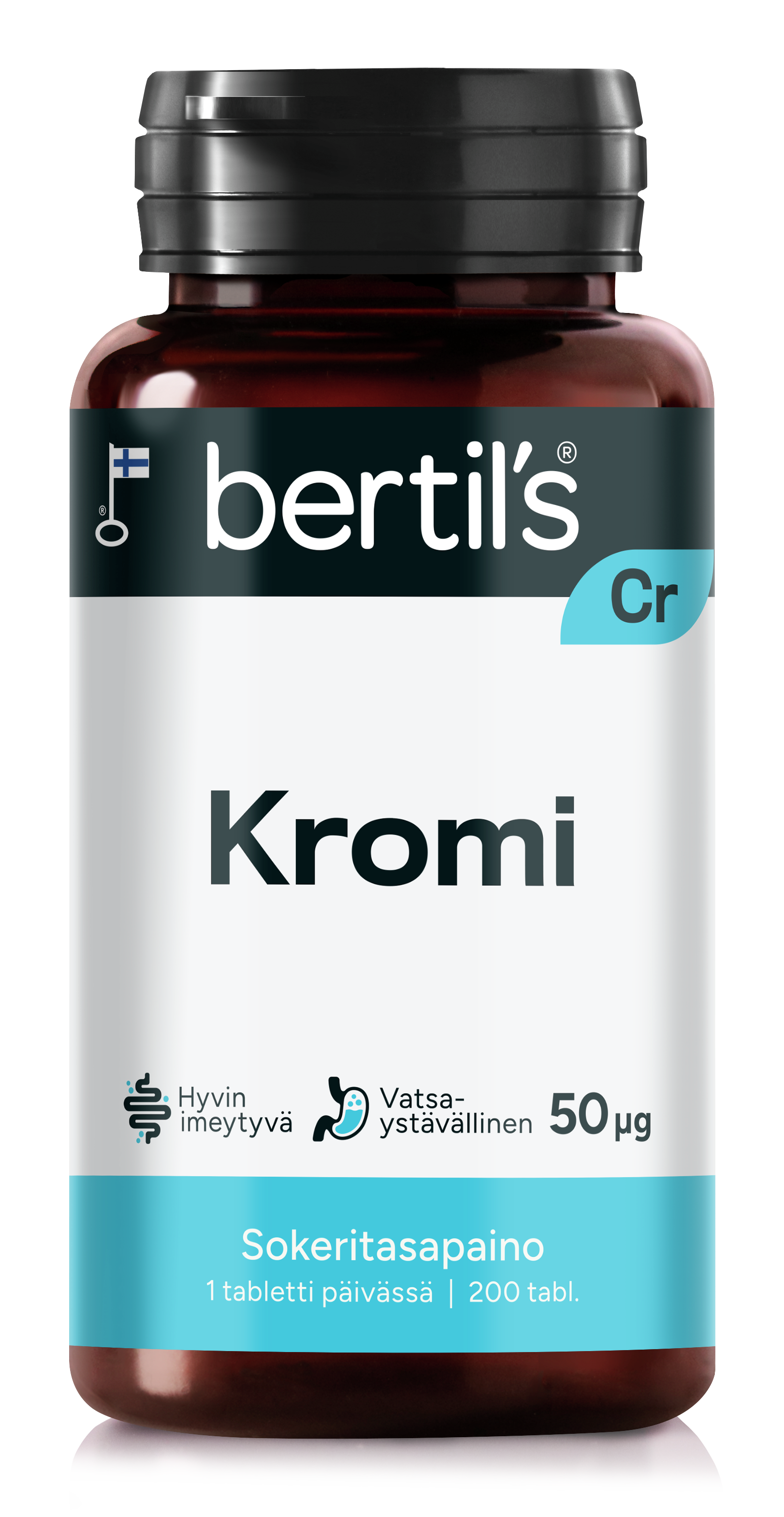 bertil’s Kromi sisältää 50 μg erinomaisesti elimistöön imeytyvää kromipikolinaattia, joka ei ärsytä vatsaa. Kromia tarvitaan elimistön tasapainoiseen sokeriaineenvaihduntaan ja kromi edistääkin verensokeriarvojen pysymistä normaalina.